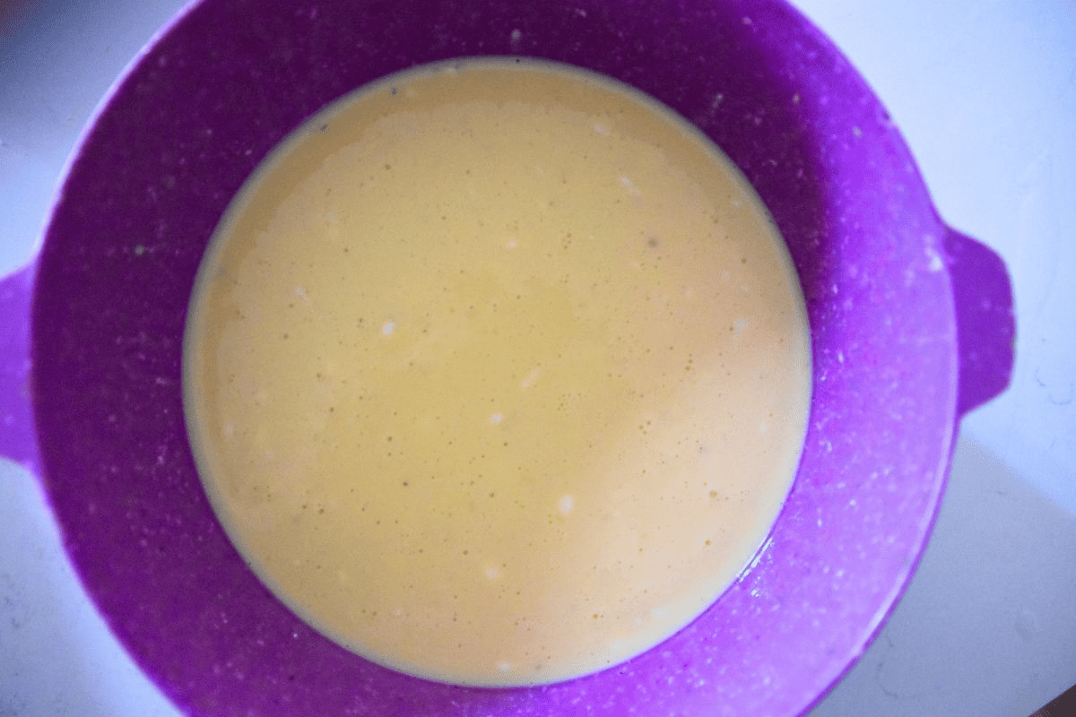This dish comes together quickly with a mix of eggs, sour cream, milk, and seasonings whisked together.