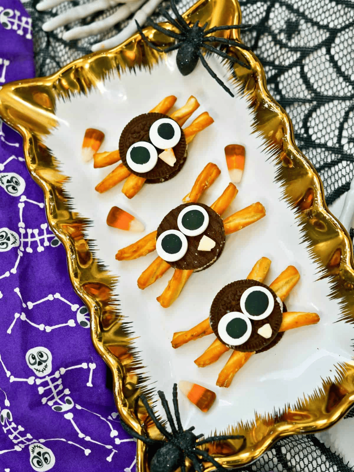 - Oreo Cookies - These classic chocolate sandwich cookies will be the spider's body in this fun snack. You will also use some of the cream filling to help glue the eyes and nose to the spider.